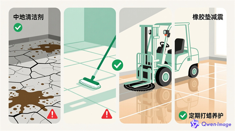 避免尖锐重物冲击:叉车、货架脚需加装橡胶垫。